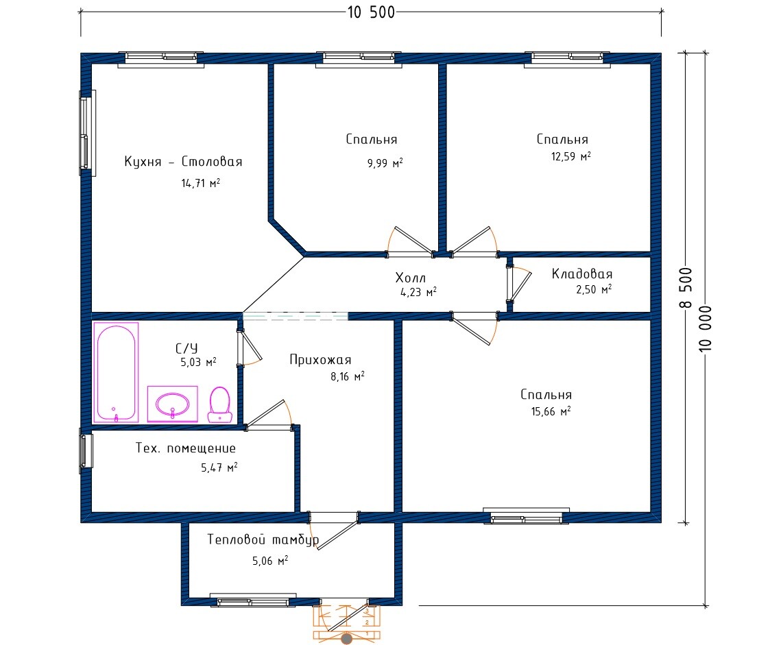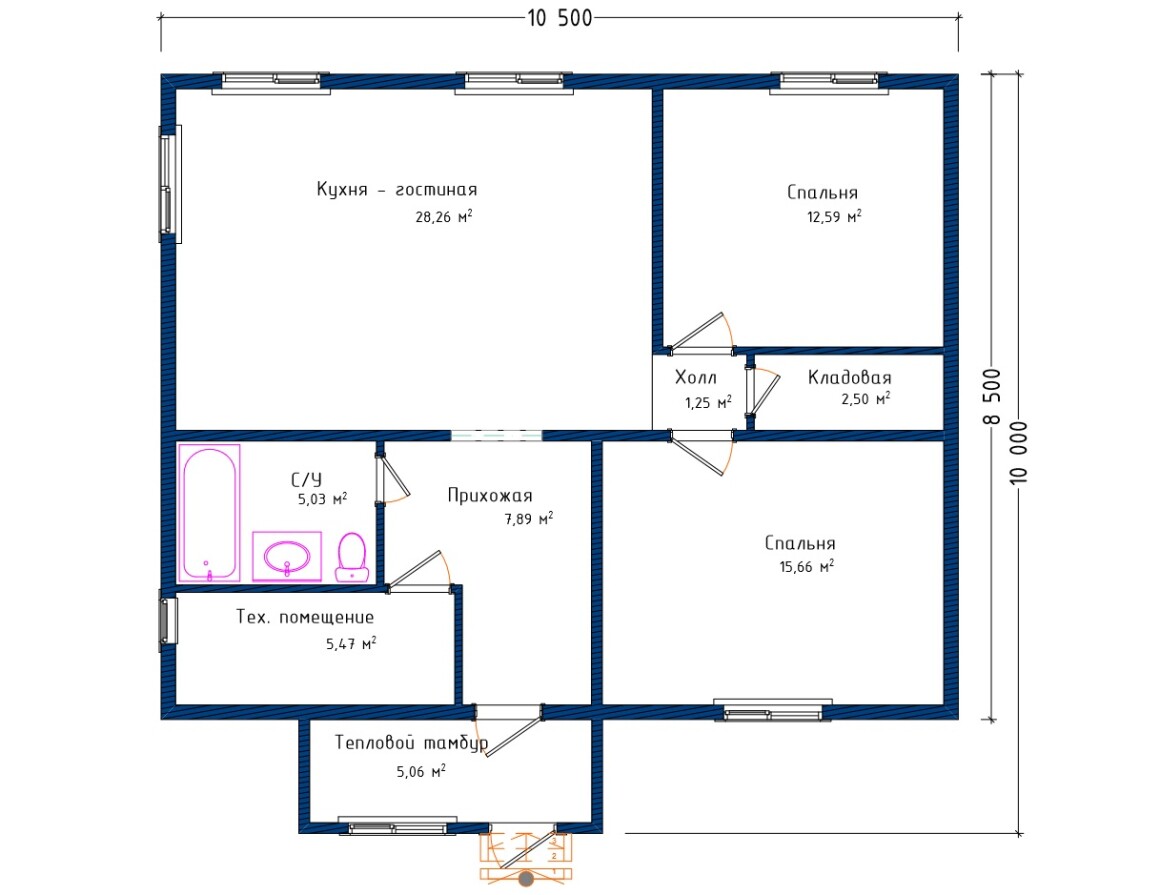 - Внешняя дверь: металлическая утепленная, в комплект двери входит фурнитура, замок и глазок.